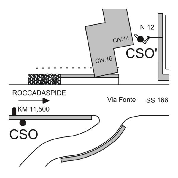 | Contrassegni | [{"simbolo_contrassegno":"B1","materializzazione":"(CSO) – Bullone infisso nel muro di scarpa alla S.S.166 all'altezza del Km 11,500 ."},{"simbolo_contrassegno":"B4","materializzazione":"(CSO') – Centrino universale (orizzontale) infisso sul muro in cemento armato al civico 12 ."}] |