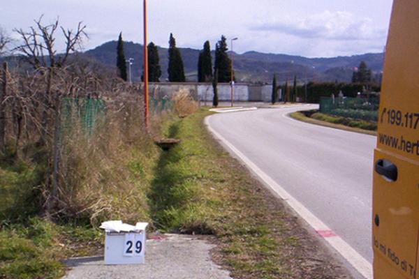 | Materializzazione | Centrino metallico infisso su platea di accesso a frutteto in Via Assisi lato cimitero. |