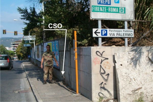 [{"simbolo_contrassegno":"B1","materializzazione":"(CSO) – Bullone infisso nel muro di sostegno, di fronte al distributore Esso, lato destro in direzione stazione."}]