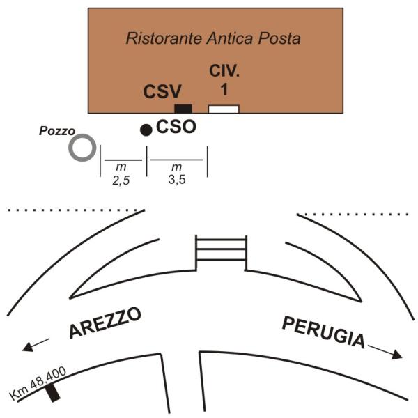 | Contrassegni | [{"simbolo_contrassegno":"P3","materializzazione":"(CSO) – Chiusino in ghisa posto alla base della facciata, tra il pozzo e la porta d'ingresso del ristorante."},{"simbolo_contrassegno":"V1","materializzazione":"(CSV) – Mensola infissa sulla facciata del ristorante, a sinistra della porta d'ingresso."}] |