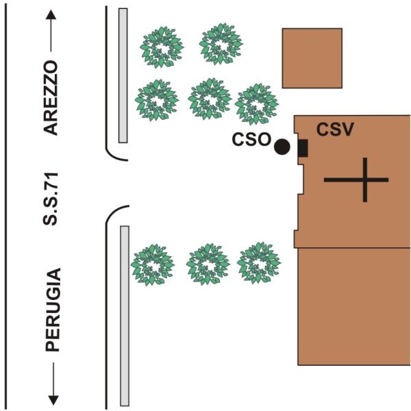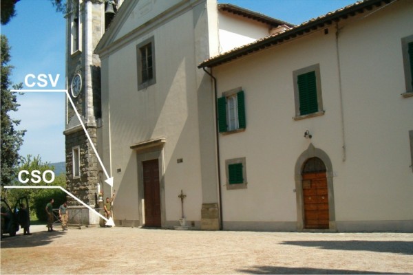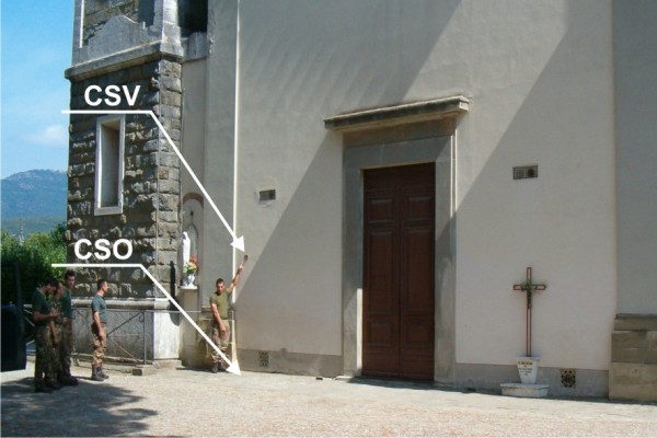 [{"simbolo_contrassegno":"P3","materializzazione":"(CSO) – Pozzetto in ghisa posto alla base della facciata della chiesa al km 134,350 della S.R.71, presso la lesena sinistra."},{"simbolo_contrassegno":"V1","materializzazione":"(CSV) – Mensola infissa sulla facciata, in corrispondenza del CSO."}]