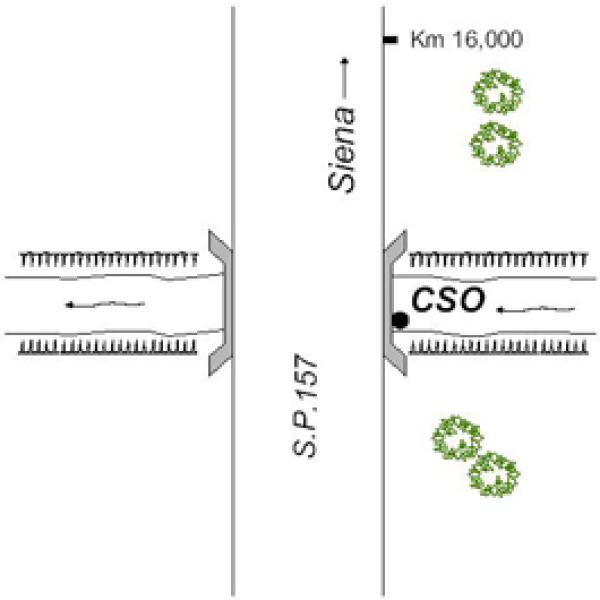 | Contrassegni | [{"simbolo_contrassegno":"B1","materializzazione":"(CSO) – Bullone infisso esternamente al parapetto destro (direzione Roccastrada) in cemento del ponticello al Km 15,922, sulla S.P.157."}] |