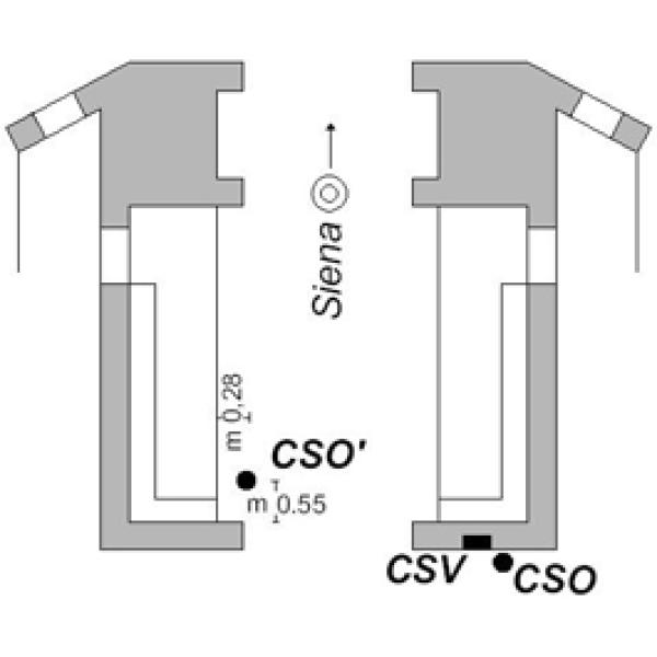 | Contrassegni | [{"simbolo_contrassegno":"B1","materializzazione":"(CSO) – Bullone infisso nel lato esterno del muro della porta, a 2,80 metri dallo stipite destro entrando in direzione del cenro di Siena."},{"simbolo_contrassegno":"B2","materializzazione":"(CSO') – Chiodo anonimo infisso nella pavimentazione (spigolo interno sinistro entrando)."},{"simbolo_contrassegno":"V1","materializzazione":"(CSV) – Mensola infissa nella facciata, in corrispondenza del CSO."}] |