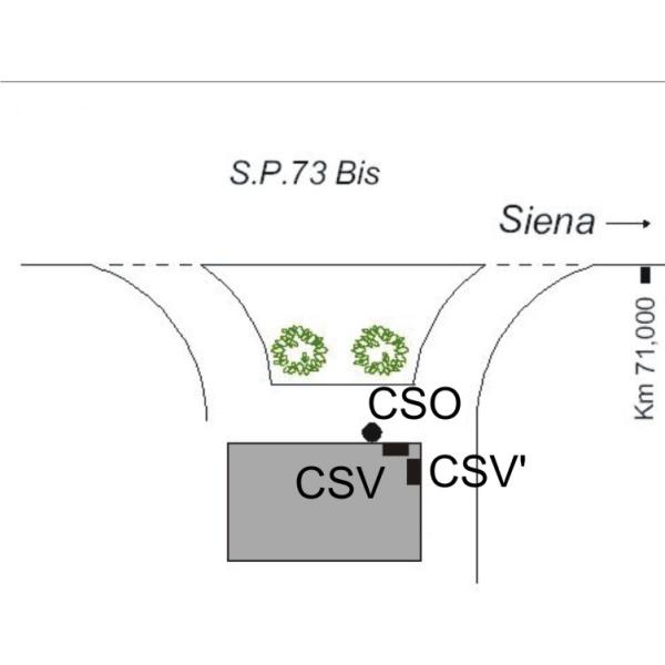 | Contrassegni | [{"simbolo_contrassegno":"P3","materializzazione":"(CSO) – Chiusino in ghisa di III categoria interrato alla base della parete nord del fabbricato, spigolo verso Siena."},{"simbolo_contrassegno":"V1","materializzazione":"(CSV) – Mensola infissa sulla parete nord, in corrispondenza del CSO."},{"simbolo_contrassegno":"V3","materializzazione":"(CSV') – Mensola posta sulla parete est del fabbricato, presso il predetto spigolo (incassato nel muro)."}] |