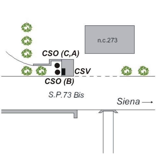 | Contrassegni | [{"simbolo_contrassegno":"P2","materializzazione":"(CSO) – Chiusino in ghisa di II categoria in corrispondenza della risega formata dal casotto pi\u00f9 piccolo con un muretto in pietra. Sono stati ritrovati sia il chiusino in ghisa con contrassegni \"C\" ed \"A\", sia un pozzetto in mattoni, rialzato con tubo in PVC e coperchio in ghisa, posto pi\u00f9 vicino alla strada, con contrassegno \"B\"."},{"simbolo_contrassegno":"V1","materializzazione":"(CSV) – Mensola posta sulla parete in corrispondenza del CSO."},{"simbolo_contrassegno":"P2","materializzazione":"(CSO) – Chiusino in ghisa di II categoria in corrispondenza della risega formata dal casotto pi\u00f9 piccolo con un muretto in pietra. Sono stati ritrovati sia il chiusino in ghisa con contrassegni \"C\" ed \"A\", sia un pozzetto in mattoni"}] |