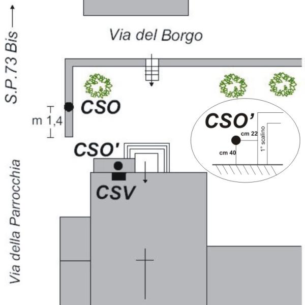 | Contrassegni | [{"simbolo_contrassegno":"B4","materializzazione":"(CSO) – Centrino universale infisso sulla sommit\u00e0 del muro di contenimento del giardino della chiesa a sinistra dell'accesso carrabile."},{"simbolo_contrassegno":"P5","materializzazione":"(CSO) – Pozzetto di IV categoria interrato a destra della gradinata della chiesa ora coperto da una rampa per disabili e non misurabile, in corrispondenza del CSV."},{"simbolo_contrassegno":"V1","materializzazione":"(CSV) – Mensola infissa sulla facciata della chiesa, a destra del portone."}] |