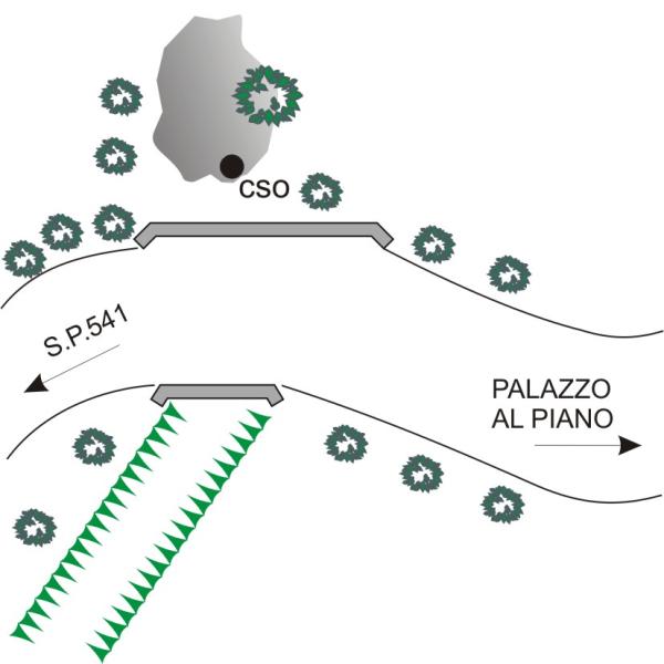 [{"simbolo_contrassegno":"B2","materializzazione":"(CSO) – Centrino anonimo (ENEL n\u00b08479) infisso su roccia affiorante posto a monte della strada bianca che dalla S.P. 541 conduce a Palazzo al Piano, all'altezza del primo ponticello con entrambi i parapetti in pietra."}]