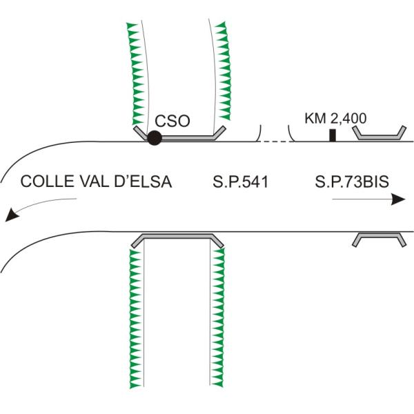 | Contrassegni | [{"simbolo_contrassegno":"B2","materializzazione":"(CSO) – Centrino anonimo (ENEL n\u00b08535) infisso alla sommit\u00e0 del cordolo in cemento del ponticello, lato destro andando verso Colle Val d'Elsa in corrispondenza del terzo montante pi\u00f9 alto del guardrail."}] |