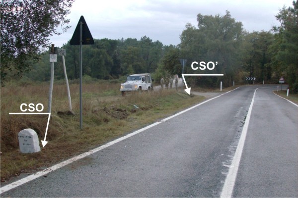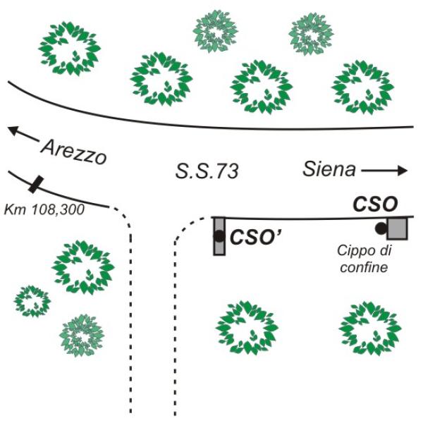 [{"simbolo_contrassegno":"P5","materializzazione":"(CSO) – Pozzetto rialzato con tubo in pvc e protetto da coperchio in ghisa posto alla base del piccolo cippo di confine, lato Arezzo."},{"simbolo_contrassegno":"B4","materializzazione":"(CSO') – Centrino universale posto sul muretto del ponticello che conduce alla strada bianca."}]
