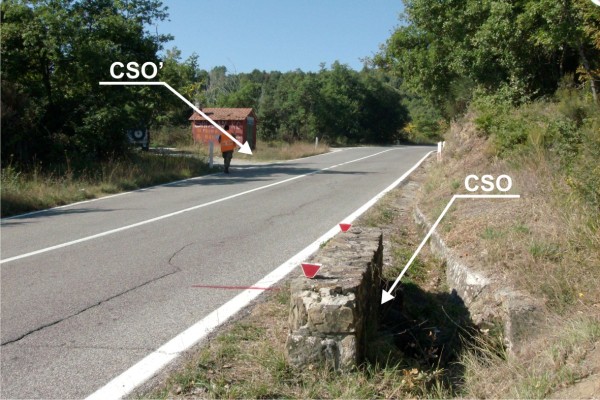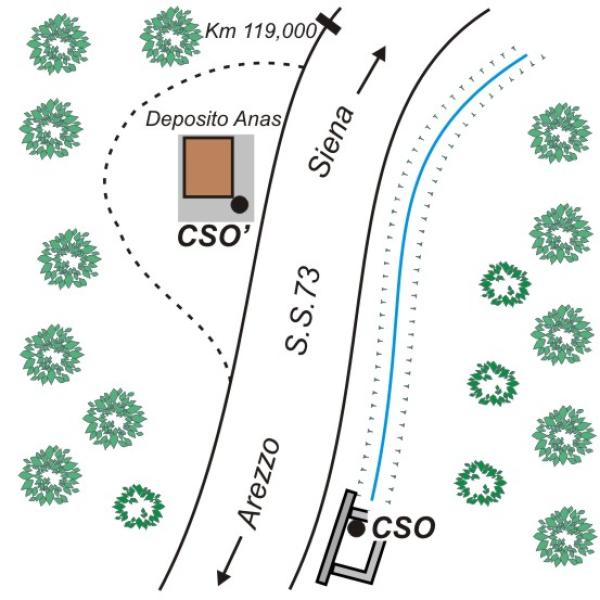 | Contrassegni | [{"simbolo_contrassegno":"B1","materializzazione":"(CSO) – Bullone infisso all'interno di un pozzetto di raccolta delle acque posto sul lato destro della strada, procedendo in direzione Siena,presso il Km 119,060."},{"simbolo_contrassegno":"B4","materializzazione":"(CSO') – Centrino universale posto sulla base della piattaforma in cemento del casotto ANAS."}] |
