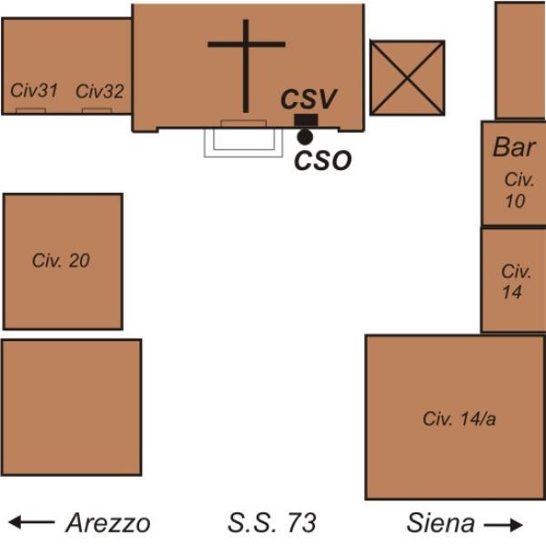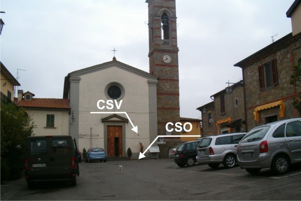 [{"simbolo_contrassegno":"P3","materializzazione":"(CSO) – Chiusino in ghisa posto alla base della facciata, a destra della porta d'ingresso della chiesa parrocchiale."},{"simbolo_contrassegno":"V1","materializzazione":"(CSV) – Mensola infissa sulla facciata , in corrispondenza del CSO."}]