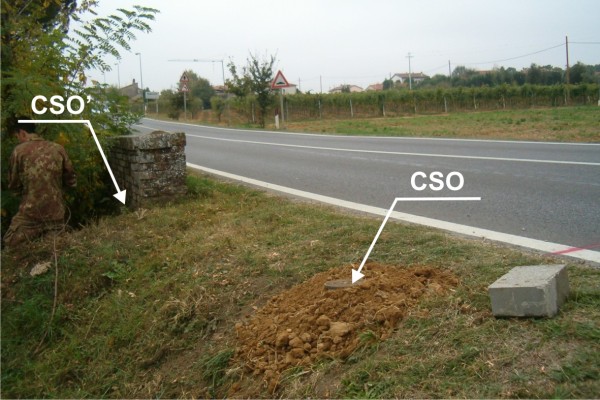| Contrassegni | [{"simbolo_contrassegno":"P5","materializzazione":"(CSO) – Pozzetto rialzato con tubo in pvc e protetto da coperchio in ghisa posto sul bordo strada, a circa 3,50 m dalla testa del parapetto."},{"simbolo_contrassegno":"B1","materializzazione":"(CSO') – Bullone infisso sul lato esterno della spalletta del ponticello, direzione Arezzo."}] |