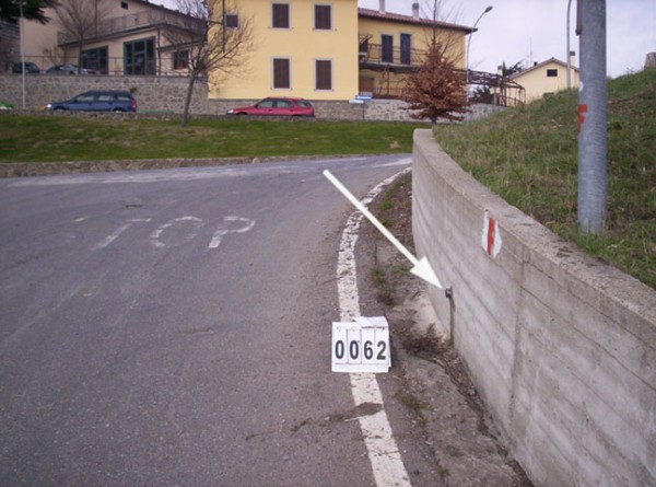 | Contrassegni | [{"simbolo_contrassegno":"B1","materializzazione":"(CSO) – Bullone infisso su muro di c.a. al bivio per frantoio \"I Cascetti\" a circa 9 m. dal suo inizio, a destra verso Roccastrada."}] |