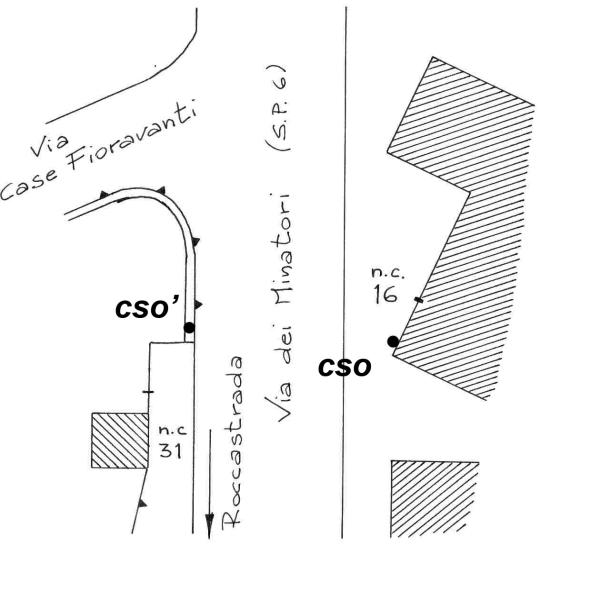 [{"simbolo_contrassegno":"B1","materializzazione":"(CSO) – Bullone infisso presso lo spigolo destro della facciata, lato strada, dell'abitazione al n\u00b0 civ. 16 di via Dei Minatori."},{"simbolo_contrassegno":"B4","materializzazione":"(CSO') – Centrino universale infisso sulla sommit\u00e0 della cimasa, all'inizio del muro di sostegno, di fronte al CSO, lato opposto della strada."}]
