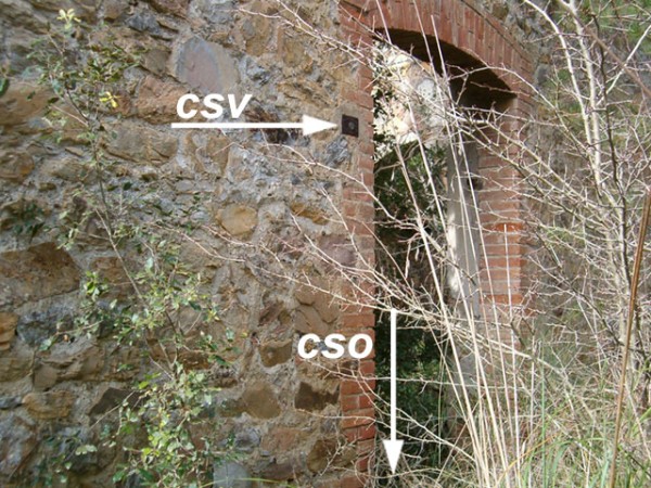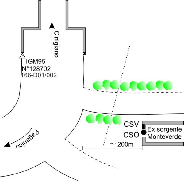 | Contrassegni | [{"simbolo_contrassegno":"B3","materializzazione":"(CSO) – Cerchio inciso all'estremit\u00e0 sinistra della soglia della porta, che si apre sulla facciata laterale destra del rudere della sorgente Monteverdi, a circa 200 m. dal ponte sul fiume Ombrone, procedendo su carrareccia, che si stacca al km 1,900 della SP 7, scendendo sull'argine del fiume in riva destra."},{"simbolo_contrassegno":"V3","materializzazione":"(CSV) – Piastrina antica infissa nella stessa facciata, a sinistra della medesima porta."}] |