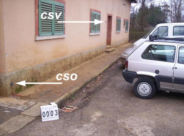 [{"simbolo_contrassegno":"B1","materializzazione":"(CSO) – Bullone infisso sullo spigolo sinistro della facciata del fabbricato viaggiatori, lato piazzale di posteggio."},{"simbolo_contrassegno":"V6","materializzazione":"(CSV) – Piastrina con cilindretto infissa sulla stessa facciata a sinistra della porta."}]