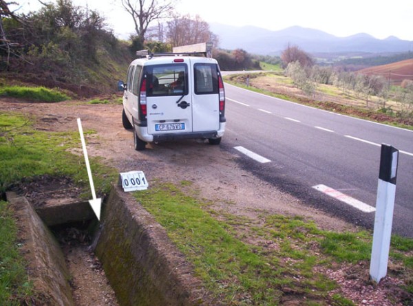 [{"simbolo_contrassegno":"B1","materializzazione":"(CSO) – Bullone infisso all'interno di muro inclinato in cemento di una canaletta raccogliacque nei pressi del suo tombino, sulla sinistra dell'incrocio con una carrareccia, sulla destra della strada in direzione Roccastrada."}]
