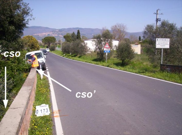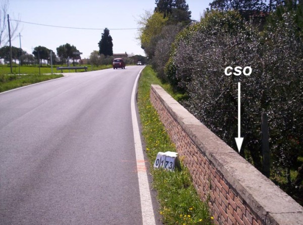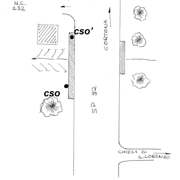 | Contrassegni | [{"simbolo_contrassegno":"B1","materializzazione":"(CSO) – Bullone infisso su muro di sostegno sulla sinista andando verso Cortona, dopo 40 m. dal bivio per la chiesa di S. Andrea"},{"simbolo_contrassegno":"B2","materializzazione":"(CSO') – Centrino infisso sulla sommit\u00e0 e alla fine del parapetto di sinistra."}] |