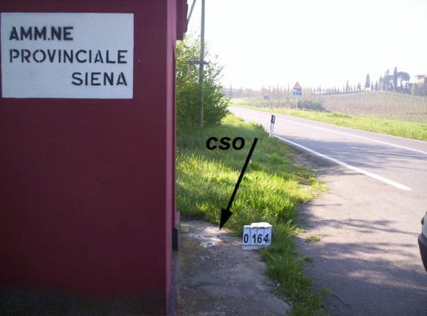 | Contrassegni | [{"simbolo_contrassegno":"B4","materializzazione":"(CSO) – Centrino infisso sul basamento, spigolo destro della facciata, del magazzino ANAS."},{"simbolo_contrassegno":"B2","materializzazione":"(CSO') – Centrino infisso sullo stesso basamento sullo spigolo opposto."}] |
