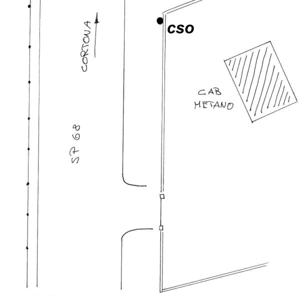 | Contrassegni | [{"simbolo_contrassegno":"B1","materializzazione":"(CSO) – Bullone murato sul muro di recinzione della cabina Metano, spigolo verso Cortona, sul lato destro della strada."}] |