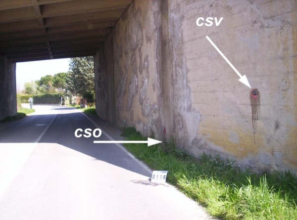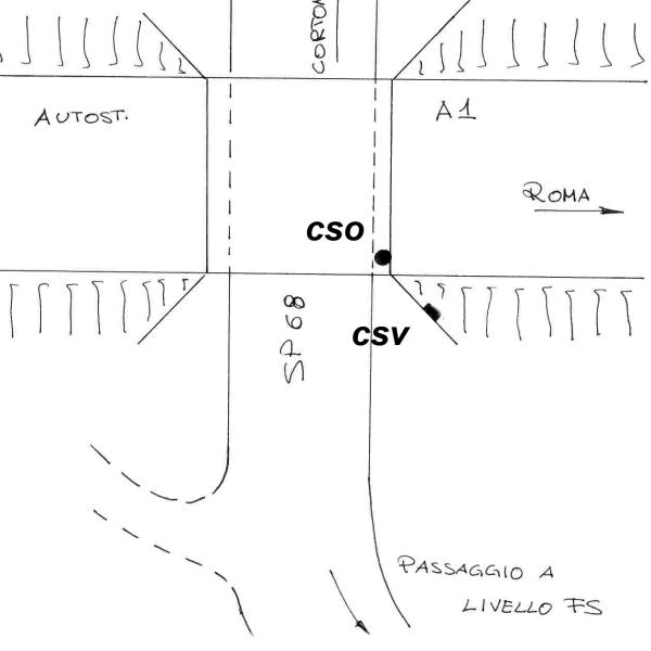 | Contrassegni | [{"simbolo_contrassegno":"B1","materializzazione":"(CSO) – Bullone infisso all'inizio del sottopasso autostradale, a destra andando verso Cortona."},{"simbolo_contrassegno":"V6","materializzazione":"(CSV) – Piastrina con cilindretto infissa sul muro d'ala del medesimo lato del sottopasso."}] |