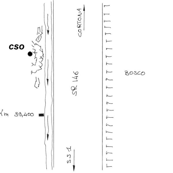 | Contrassegni | [{"simbolo_contrassegno":"B4","materializzazione":"(CSO) – Centrino universale infisso su un affioramento in arenaria, prossimo al km 39,400 , sulla sinistra della strada procedendo verso Cortona."}] |
