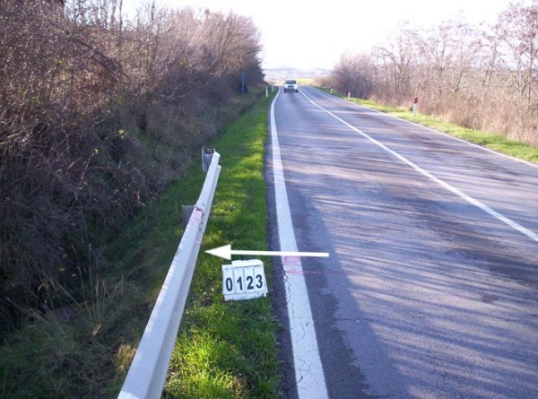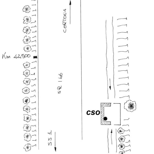 | Contrassegni | [{"simbolo_contrassegno":"B1","materializzazione":"(CSO) – Bullone infisso all' interno di un tombino, posto a destra della strada procedendo verso Cortona."}] |