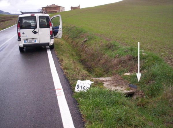 | Contrassegni | [{"simbolo_contrassegno":"B1","materializzazione":"(CSO) – Bullone infisso sulla spalla interna di un tombino raccogliacque, posto a destra della regionale procedendo in direzione Cortona."}] |