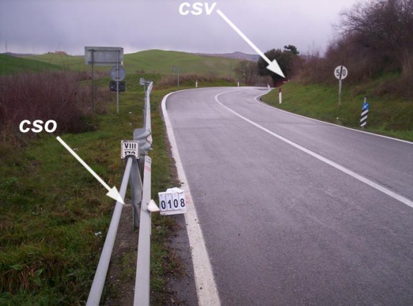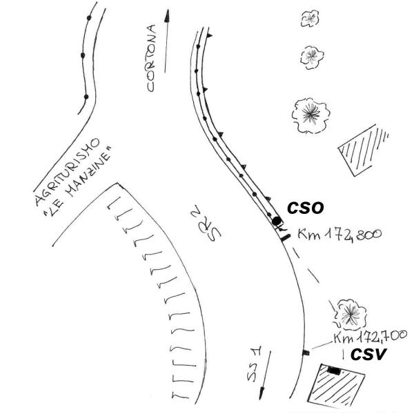 [{"simbolo_contrassegno":"B4","materializzazione":"(CSO) – Centrino universale infisso sulla sommit\u00e0 del muro di sostegno con guard-rail nei pressi del bivio per \"Agriturismo Le Manzine\", all'inizio e sulla destra della strada verso Cortona."},{"simbolo_contrassegno":"V6","materializzazione":"(CSV) – Piastrina con cilindretto infissa presso lo spigolo destro della parete a sinistra del magazzino – cantoniera, circa 100 m. prima del CSO procedendo nella stessa direzione."}]