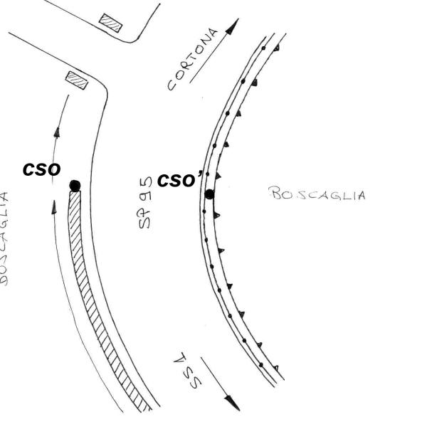 [{"simbolo_contrassegno":"B1","materializzazione":"(CSO) – Bullone infisso nella testa del muro parapetto alla canaletta di scolo, lato Cortona, sulla sinistra della strada verso la stessa localit\u00e0."},{"simbolo_contrassegno":"B4","materializzazione":"(CSO') – Centrino universale fissato alla sommit\u00e0 del muro di sostegno con guard-rail, dalla parte opposta della provinciale, in corrispondenza del CSO."}]