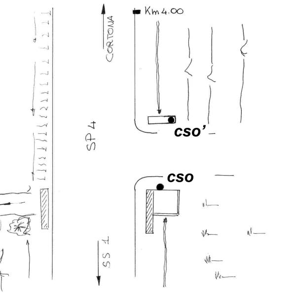 [{"simbolo_contrassegno":"B1","materializzazione":"(CSO) – Bullone infisso nella spalletta destra del tombino del ponticello di accesso ai campi, lato destro direzione Cortona."},{"simbolo_contrassegno":"B4","materializzazione":"(CSO') – Centrino universale infisso sulla sommit\u00e0 della spalletta sinistra dello stesso ponticello, lato opposto."}]