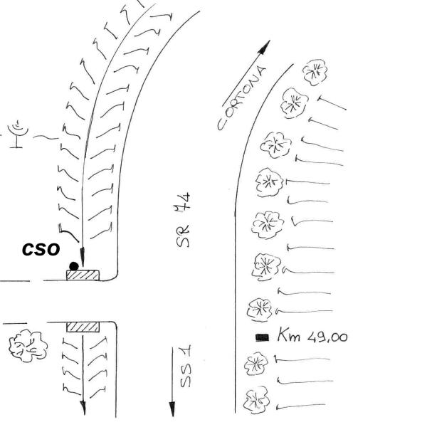 | Contrassegni | [{"simbolo_contrassegno":"B1","materializzazione":"(CSO) – Bullone infisso sulla spalla destra del ponticello di ingresso alla casa in corrispondenza del km 49,000 , lato opposto della strada a sinistra procedendo verso Cortona."}] |