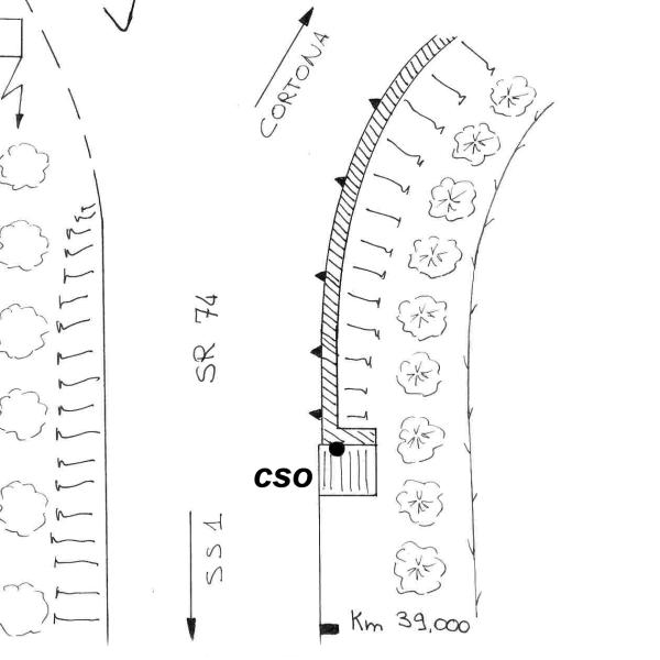 | Contrassegni | [{"simbolo_contrassegno":"B1","materializzazione":"(CSO) – Bullone murato sulla testa del muro di contenimeto adiacente un tombino con grata di raccolta acque, posto a destra della strada in direzione Cortona."}] |