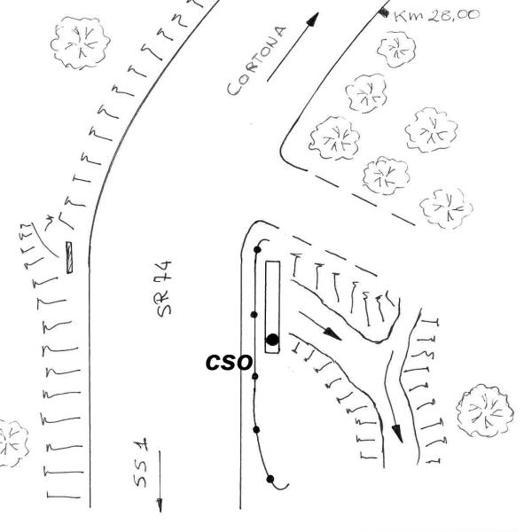 [{"simbolo_contrassegno":"B4","materializzazione":"(CSO) – Centrino universale infisso sulla sommit\u00e0 di un ponte su un ruscello, lato a valle riva destra, appena prima di un bivio con una carrareccia a destra della strada in direzione Cortona."}]