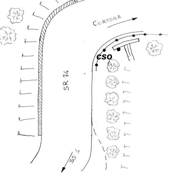 | Contrassegni | [{"simbolo_contrassegno":"B1","materializzazione":"(CSO) – Bullone infisso nella spalla in pietra del ponticello di canaletta di raccolta acque, a destra della strada in direzione Cortona."}] |