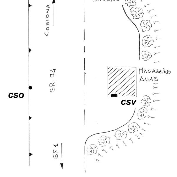 | Contrassegni | [{"simbolo_contrassegno":"B1","materializzazione":"(CSO) – Bullone infisso nel muro di sostegno, dall'altra parte della strada rispetto al magazzino ANAS, posto in una piazzola poco prima del km 26,000, procedendo verso Cortona."},{"simbolo_contrassegno":"V6","materializzazione":"(CSV) – Piastrina con cilindretto infissa presso lo spigolo sinistro, della parete opposta a Manciano, del magazzino ANAS."}] |