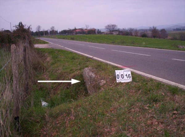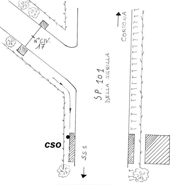 | Contrassegni | [{"simbolo_contrassegno":"B1","materializzazione":"(CSO) – Bullone infisso nel muro del ponticello dello scolo acque, che attraversa la strada, lato sinistro in direzione Cortona, poco prima della propriet\u00e0 al n\u00b0 civ. 17 di strada della Sgrilla."}] |
