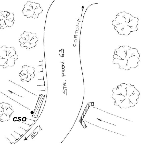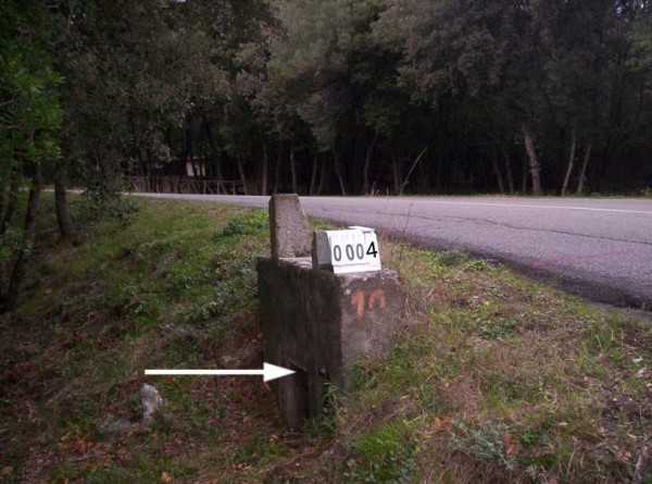 [{"simbolo_contrassegno":"B1","materializzazione":"(CSO) – Bullone infisso nel muro di sostegno di un tombino, lato sinistro in direzione Cortona."}]