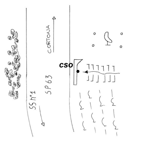 | Contrassegni | [{"simbolo_contrassegno":"B1","materializzazione":"(CSO) – Bullone infisso all'interno del tombino, al centro della parete, lato destro della strada, direzione Cortona."}] |