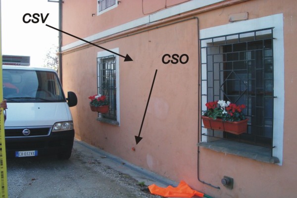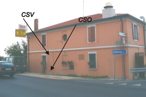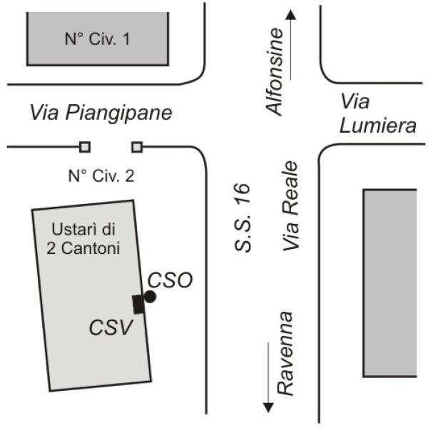 | Contrassegni | [{"simbolo_contrassegno":"B1","materializzazione":"(CSO) – Bullone del Comune di Ravenna infisso alla base della facciata della Trattoria \"Ustar\u00ec di 2 Cantoni\", tra le due finestre di sinistra (ARPA N\u00b0 106090). Misurabile solo con stadia da 2 metri."},{"simbolo_contrassegno":"V4","materializzazione":"(CSV) – Piastrina zincata del Catasto infissa sulla facciata suddetta, in corrispondenza del CSO. Non misurabile perch\u00e8 ricoperto da intonaco."}] |