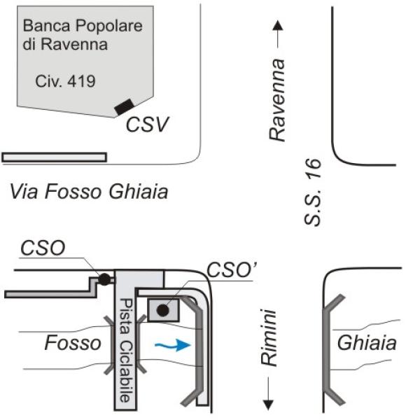 | Contrassegni | [{"simbolo_contrassegno":"B4","materializzazione":"(CSO') – Centrino universale Inox, non recante scritte, infisso sulla sommit\u00e0 del muro di contenimento, in riva sinistra, a monte del ponticello della pista ciclabile. Coincidente con Geotrav 089703 Associato."},{"simbolo_contrassegno":"V5","materializzazione":"(CSV) – Targa in marmo del Catasto Regionale infissa sulla parete inclinata a sinistra dell'alloggiamento del Bancomat della Banca Popolare di Ravenna, al N\u00b0civ. 419."},{"simbolo_contrassegno":"B6","materializzazione":"(CSO') Centrino Inox di tipo \"C\" infisso sulla sommit\u00e0, in centro, del casotto della cassa d'ispezione dell'acquedotto, posto a sinistra del ponticello della pista ciclabile. Misurabile con 1\/2 sfera. Conincidente con Geotrav 089703 CT."}] |