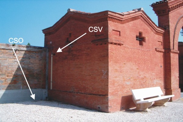| Contrassegni | [{"simbolo_contrassegno":"P2","materializzazione":"(CSO) – Chiusino in ghisa di II\u00b0 Cat. interrato a sinistra dell'ingresso del cimitero, nella risega del muro di cinta (ARPA N\u00b0 116020)."},{"simbolo_contrassegno":"V2","materializzazione":"(CSV) – Piastrina a barilotto IGM infissa sul muro laterale dell'avancorpo di sinistra, in corrispondenza del CSO. Rattaccata nel 2005 al CSO con quota del 1999."}] |