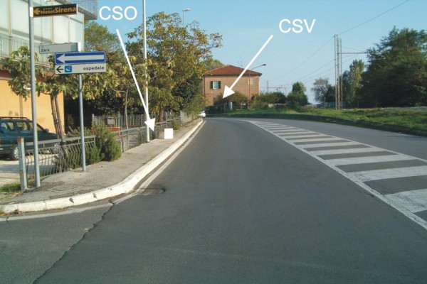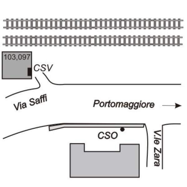 [{"simbolo_contrassegno":"B1","materializzazione":"(CSO) – Bullone IGM infisso nel muro di sostegno della strada, lato volto alle case circa 12 m dall'estremit\u00e0 su Via Zara (ARPA N\u00b0 124200)."},{"simbolo_contrassegno":"V4","materializzazione":"(CSV) – Piastrina zincata del Catasto infissa sulla facciata del casello ferroviario 103,097, situato dall'altra parte della strada rispetto al CSO, a ca. 80 m di distanza. Dislivello misurato nel 2005 con quota ARPA del CSO del 1999."}]