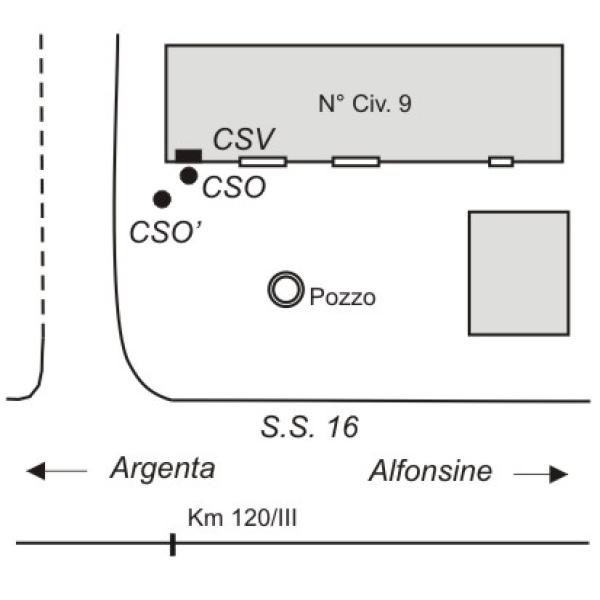 | Contrassegni | [{"simbolo_contrassegno":"P3","materializzazione":"(CSO) – Chiusino in ghisa ovale IRTA, con Alto \"A\", interrato alla base della facciata della casa al N\u00b0 Civ. 3, in prossimit\u00e0 dello spigolo sinistro (ARPA N\u00b0 092160) ."},{"simbolo_contrassegno":"V4","materializzazione":"(CSV) – Piastrina zincata del Catasto infissa sulla stessa facciata, in corrispondenza del CSO."},{"simbolo_contrassegno":"B2","materializzazione":"(CSO) – Chiodo anonimo di Altro Ente infisso sul marciapiede in cemento, a sinistra del CSO, a 49 cm dal muro e 29 cm dallo spigolo."}] |