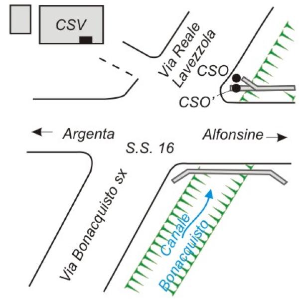 | Contrassegni | [{"simbolo_contrassegno":"P3","materializzazione":"(CSO) – Chiusino in ghisa di III\u00b0 Cat. interrato in prossimit\u00e0 dell'estremit\u00e0, lato valle, riva sinistra, del ponte (ARPA N\u00b0 092130)."},{"simbolo_contrassegno":"B2","materializzazione":"(CSO') – Chiodo anonimo dell'ARPA infisso sulla sommit\u00e0 della stessa estremit\u00e0 del ponte (ARPA N\u00b0 092131)."},{"simbolo_contrassegno":"V4","materializzazione":"(CSV) – Piastrina zincata del Catasto infissa sulla facciata della costruzione adibita a magazzino, annessa alla propiet\u00e0 affacciantesi su via Reale Lavezzola."}] |