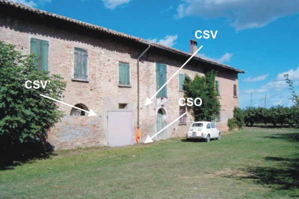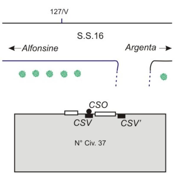 [{"simbolo_contrassegno":"P3","materializzazione":"(CSO) – Chiusino in ghisa di III\u00b0 Cat. interrato alla base della facciata, fra la porta del magazzino e l'entrata della casa al n. civ. 37 (ARPA N\u00b0 092090)."},{"simbolo_contrassegno":"V2","materializzazione":"(CSV) – Piastrina a barilotto IGM infissa nella facciata della casa, in corrispondenza del CSO."},{"simbolo_contrassegno":"V4","materializzazione":"(CSV') – Piastrina del Consorzio di Bonifica Bassa Ravennate n\u00b0 72, infissa nella stessa facciata, a sinistra del magazzino."}]