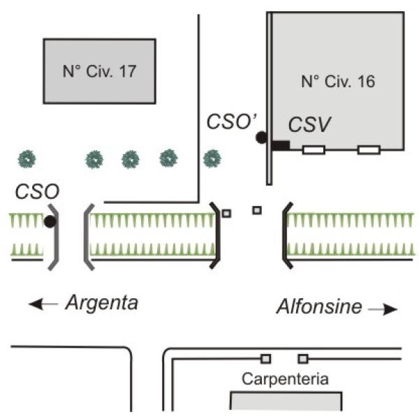 | Contrassegni | [{"simbolo_contrassegno":"B1","materializzazione":"(CSO) – Bullone IGM infisso nella spalla sinistra del ponticello d'accesso al fabbricato al n. civ. 17, sulla sinistra entrando."},{"simbolo_contrassegno":"B2","materializzazione":"(CSO') – Centrino metallico piatto del Catasto infisso sul marciapiede in cemento armato, alla base della parete laterale sinistra, in prossimit\u00e0 dello spigolo destro, della casa al n. civ. 16. Misurabile con 1\/2 sfera (ARPA N\u00b0 092070)."},{"simbolo_contrassegno":"V4","materializzazione":"(CSV) – Piastrina zincata del Catasto infissa sulla facciata principale della casa al n. civ. 16, in prossimit\u00e0 dello spigolo sinistro."}] |