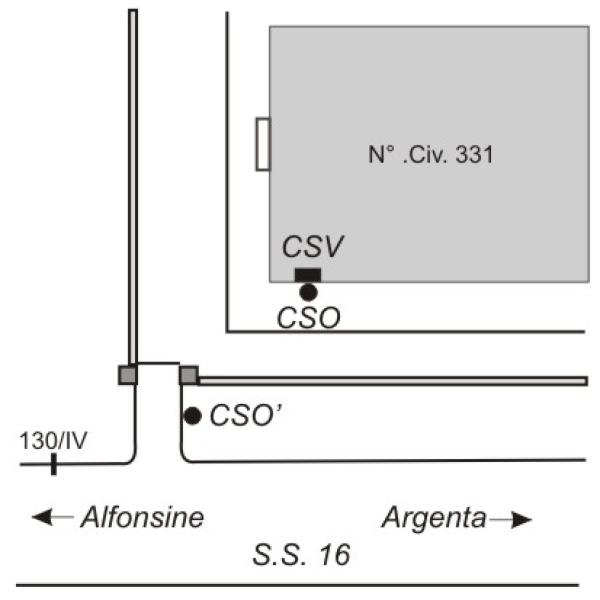 | Contrassegni | [{"simbolo_contrassegno":"P3","materializzazione":"(CSO) – Chiusino ovale in ghisa IRTA, con Alto \"A\", interrato alla base della parete volta verso strada dell'edificio, in prossimit\u00e0 dello spigolo sinistro con all'interno caposaldo IGM (ARPA N\u00b0 092060)."},{"simbolo_contrassegno":"V4","materializzazione":"(CSV) – Piastrina zincata del Catasto infissa sulla stessa facciata, in corrispondenza del CSO."},{"simbolo_contrassegno":"B1","materializzazione":"(CSO') – Bullone IGM infisso nella parete laterale destra della rampa in cemento armato d'accesso alla propiet\u00e0."}] |