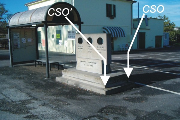 [{"simbolo_contrassegno":"B2","materializzazione":"(CSO) – Chiodo anonimo AGIP murato sul primo gradino a destra del Monumento ai Caduti sito in Piazza Don Succi, spigolo Est (ARPA N\u00b0 093100)."},{"simbolo_contrassegno":"B4","materializzazione":"(CSO) – Centrino Universale Inox infisso sul primo gradino del basamento del Monumento ai Caduti, spigolo Nord."},{"simbolo_contrassegno":"V4","materializzazione":"(CSV) – Piastrina IRTA infissa sula parete lato strada della casa al N\u00b0 113, in prossimit\u00e0 dello spigolo destro."}]