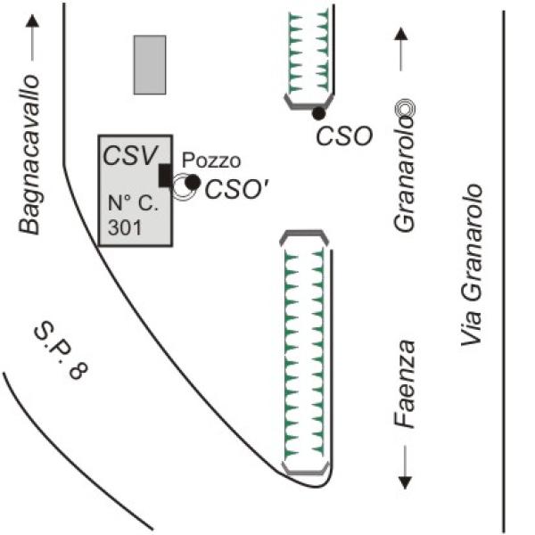 [{"simbolo_contrassegno":"B1","materializzazione":"(CSO) – Bullone IGM murato in esterno della spalletta Nord del ponte di accesso alla casa (ARPA N\u00b0 095080)."},{"simbolo_contrassegno":"B2","materializzazione":"(CSO') – Chiodo anonimo AGIP murata sul bordo circolare del pozzo antistante la casa, in precarie condizioni di stabilit\u00e0. Quotato ARPA nel 2002. Non quotata."},{"simbolo_contrassegno":"V4","materializzazione":"(CSV) – Piastrina IRTA infissa sulla facciata della casa, in corrispondenza del CSO. Non quotata."}]